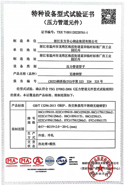 浙江東方齊心以不銹鋼系列產(chǎn)品為主導,品種有不銹鋼管、奧氏體不銹鋼管、高溫合金鋼管、雙相不銹鋼管、鎳基合金管、冷凝器用管、U形管、核電管、不銹鋼管件、法蘭、閥門等。規(guī)格有6-2020x0.8-60mm,Ф16-25長度可達33m。公司擁有精密制造鋼管的各類機械設備25臺(套),其中各類冷軋管機15臺, 冷拔機10臺,天然氣熱處理爐2套。